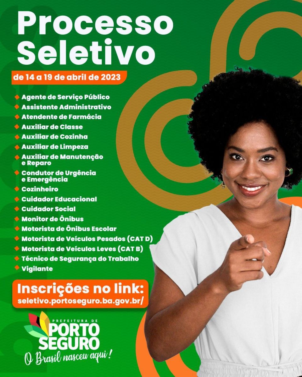 A inscrição será feita exclusivamente pela internet, de 14 a 19/04, pelo link: https://portoseguro.ba.gov.br/seletiva/ .Além da documentação necessária e das comprovações exigidas para o cargo, a seleção inclui prova objetiva, de caráter eliminatório e classificatório. 5% das vagas são destinadas a pessoas com deficiência. O resultado oficial será publicado no dia 19/05. Todas as funções, cargos, salários e demais informações sobre o Processo Seletivo estão disponíveis no Edital Nº 004/2023, publicado no Diário Oficial do Município.