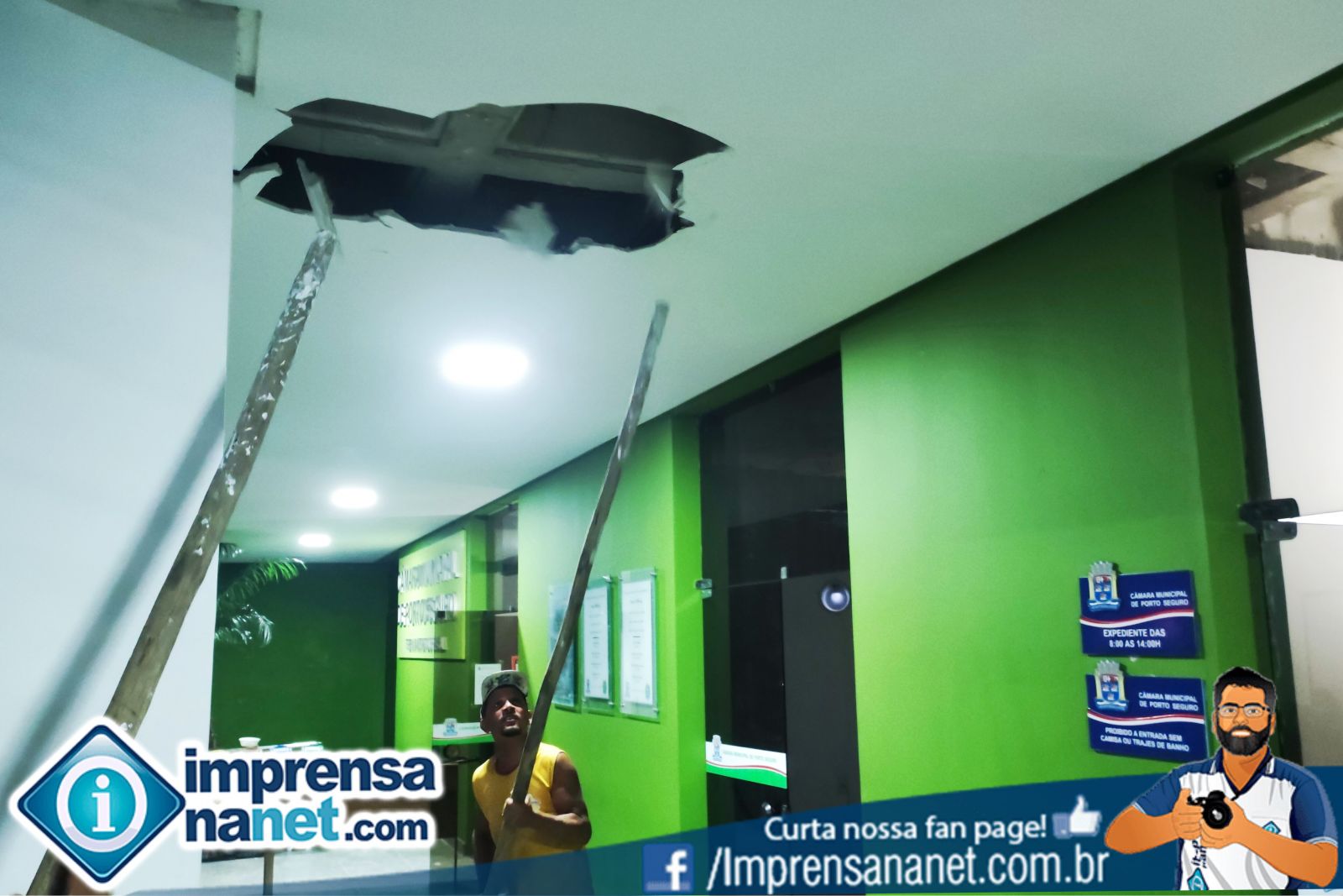 No início da noite, o presidente da Casa Legislativa, o Srº Dilmo Santiago, juntamente com os vereadores, Charles Senna, Roló e Nilsão, estiveram na Câmara para inspecionar os trabalhos da equipe que estava retirando o forro de gesso das recepções e salas que ficam abaixo do plenário. A retirada 'total' do gesso foi solicitada pelo engenheiro Neylon Almeida Carvalho que está elaborando o laudo técnico.