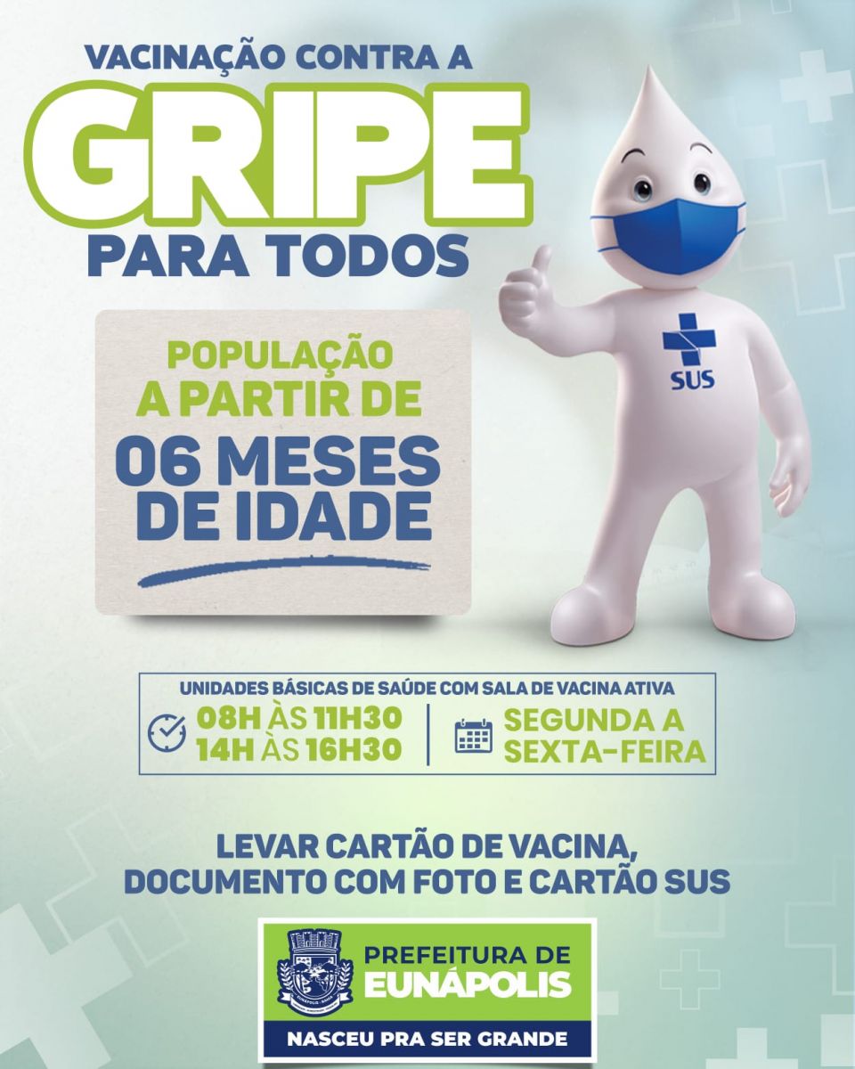 A prefeitura de Eunápolis, por meio da Secretaria Municipal de Saúde, liberou a vacinação contra a influenza (gripe) para pessoas a partir de seis meses. Com a ampliação do público-alvo, que segue as orientações do Ministério da Saúde, a meta é atingir 90% da população eunapolitana.