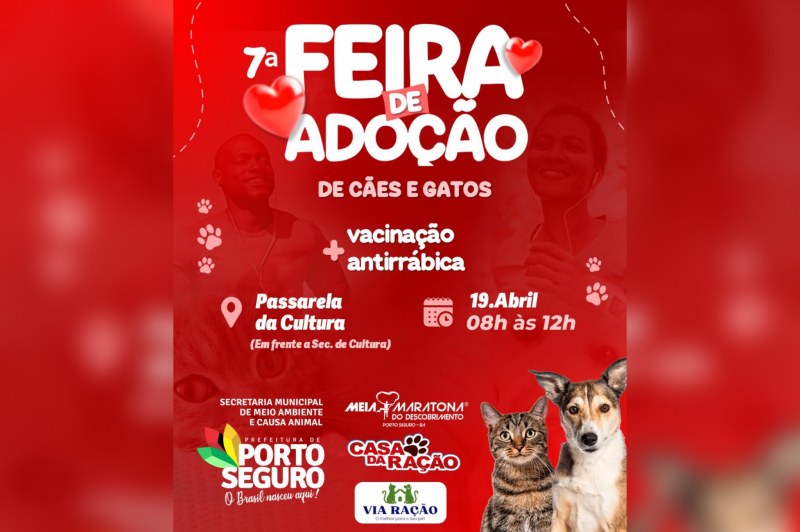 A Secretaria Municipal de Meio Ambiente e Causa Animal realiza a 7ª Feira de Adoção de Cães e Gatos, neste domingo, na Passarela da Cultura, das 8h ao meio-dia. A ação ocorre em parceria com o Instituto A Voz dos Bichos, integrando a programação da Meia Maratona de Porto Seguro.