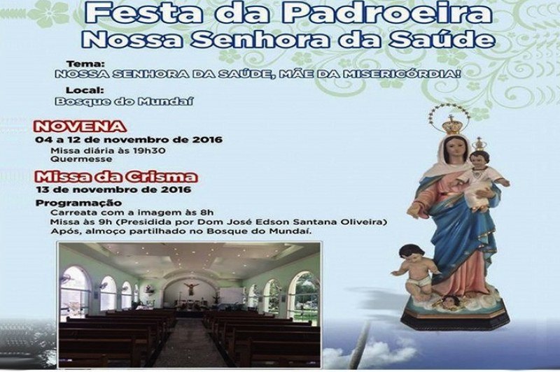 O Padre Ivan Ferreira da Rosa convida toda a comunidade de Porto Seguro à participar do “Novenário” de Nossa Senhora da Saúde que acontecerá do dia 04 à 12 de novembro. O evento contará com a realização diária da Santa Missa às 19h30 seguida de Quermesse.