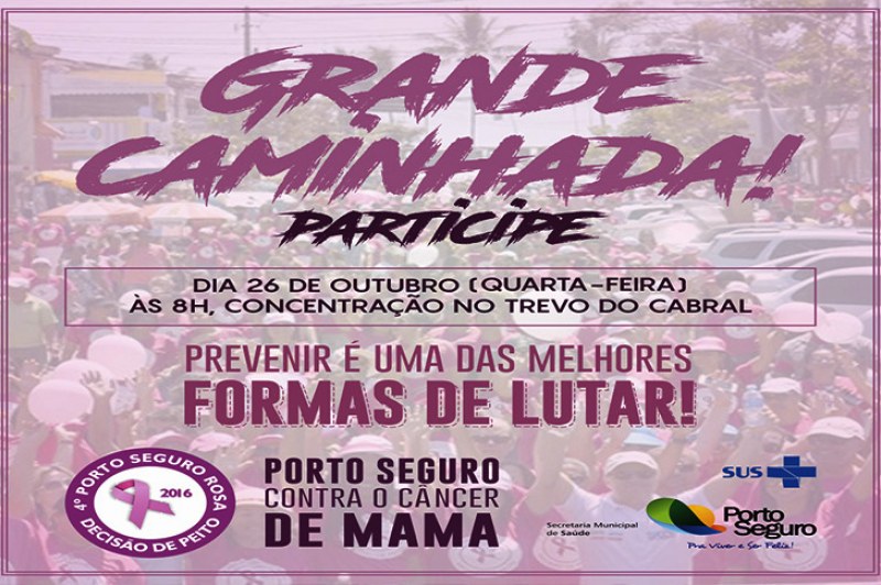 Porto Seguro prepara-se para a realização da 4º edição da caminhada pela vida, na luta contra o câncer de mama. A mobilização 'Decisão de Peito' acontecerá dia 26/10, às 08h, com concentração no Trevo do Cabral. O evento, promovido pela Prefeitura Municipal, faz parte das exitosas estratégias de rastreamento e diagnóstico preventivo, contabilizando mais de 12.800 mamografias desde a criação do projeto, em 2013.