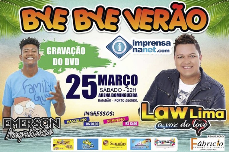 O complexo Frey Calixto vai ferver, sábado dia 25 de março tem, Bye Bye Verão na Arena Domingueira com a gravação do DVD de Emerson Negritude e lançamento da carreira solo de Law Lima, a Voz do Love. Garanta já seu ingresso no IMPRENSA INGRESSO, Praça do Relógio, Box 06, informações pelo WhatsApp 73 98155-2730.
