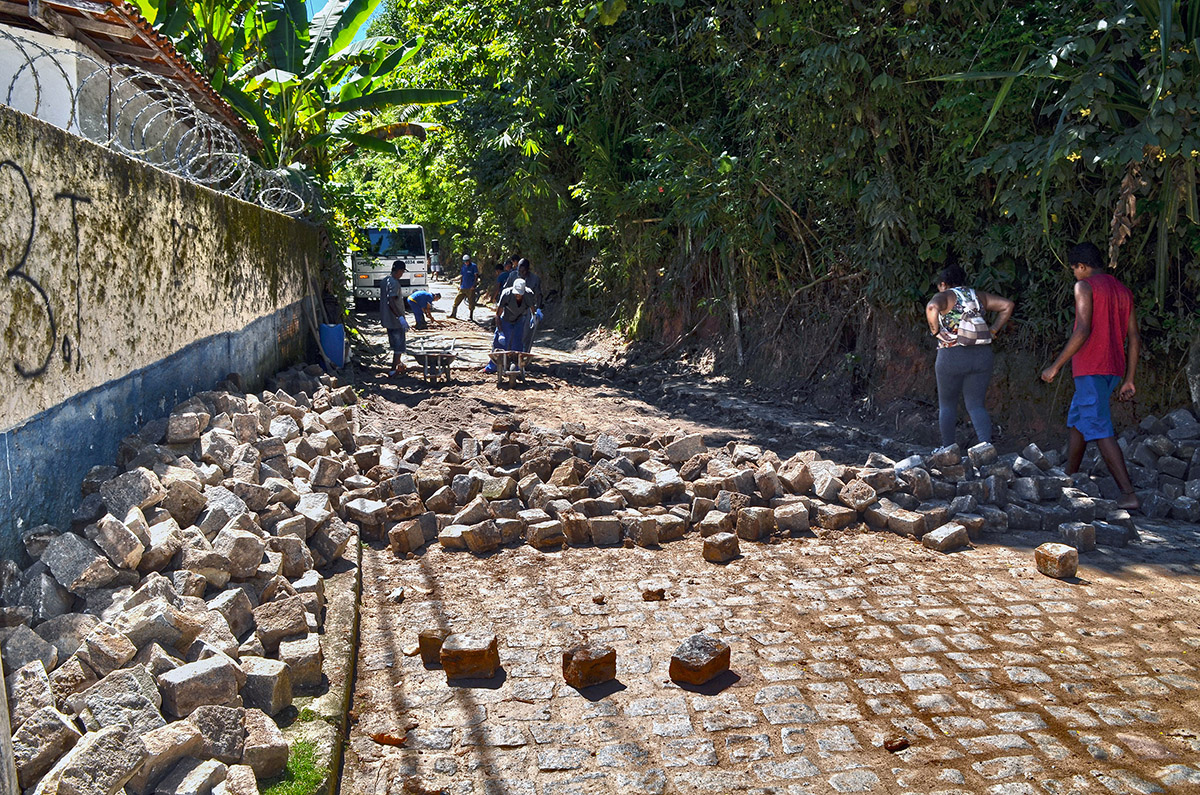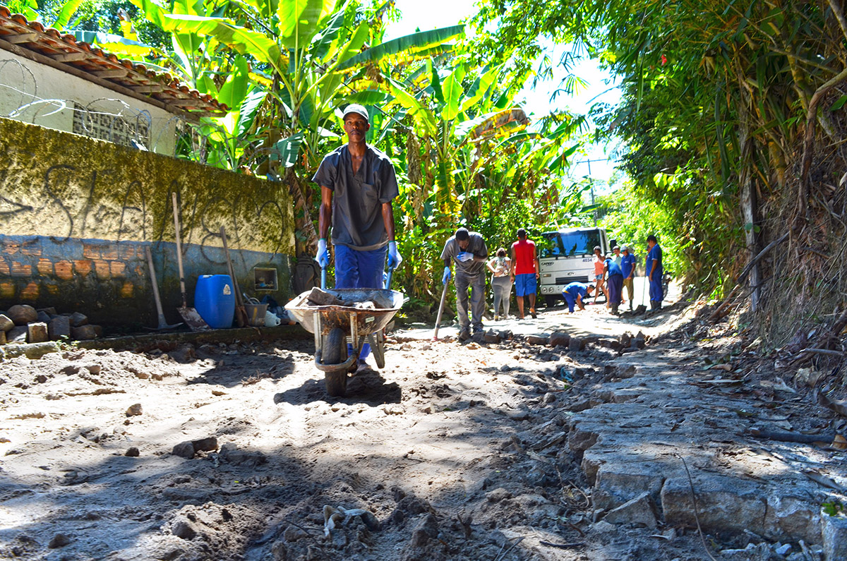 Distrito: A ladeira que dá acesso ao bairro Vilas, em Arraial d´Ajuda, foi recuperada após as fortes chuvas que deixaram a cidade em alerta há algumas semanas. Homens e máquinas da Secretaria de Obras estão trabalhando no local para recolocação dos bloquetes e paralelepípedos.