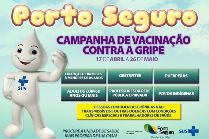 A Secretaria de Saúde de Porto Seguro promoverá de 17 de abril 26 de maio, a Campanha de combate à gripe influenza. A população será atendida pelas 39 Equipes de Saúde da Família distribuídas no município. A 19° campanha contra a influenza é voltada para crianças de seis meses a menores de cinco anos, gestantes, mães que estão no período de 45 dias após o parto, idosos a partir dos 60 anos, população indígena, portadores de doenças crônicas e professores da rede pública e privada. A Coordenadora de imunização, Aryelle Santos, explica que "a vacina é uma medida de prevenção e a aplicação das doses evita três tipos de vírus (H1N1), (H3N2) e a B”.