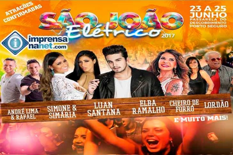 Luan Santana, Simone & Simaria, Elba Ramalho, Cheiro de Forró, Lordão, André Lima & Rafael são as principais atrações confirmadas do São João Elétrico de Porto Seguro, que será realizado entre os dias 23 e 25 de junho, na Passarela do Descobrimento, com entrada franca e organização da Prefeitura de Porto Seguro.