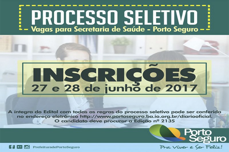 A Prefeitura Municipal de Porto Seguro, através da Secretaria de Saúde, torna público que no período de 27 e 28 de junho de 2017, serão realizadas as inscrições do Processo Seletivo Simplificado Nº 003/2017 pelo decreto Nº8634, para admissão de profissionais de nível fundamental, médio, técnico e superior. As inscrições serão efetuadas no auditório do Colégio Municipal, situado na Rua Itagibá, s/nº, centro, das 9h às 17h.