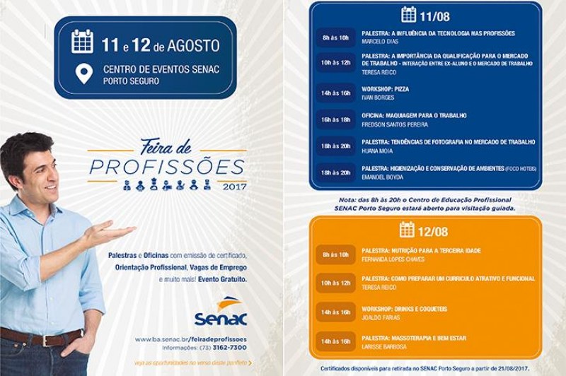 O SENAC Porto Seguro realizará a Feira de Profissões em sua sede nos próximos dias 11 (das 8h às 20h) e 12/08 (das 8h às 16h), e proporcionará aos seus visitantes contato com profissionais de diversas áreas, oferecendo um leque de conhecimentos e opções de carreiras que podem ter seus caminhos facilitados através de uma capacitação profissional de qualidade. A Feira de Profissões é uma iniciativa do SENAC Bahia, e oferecerá uma programação intensa de atividades, visando informar ao público as oportunidades de capacitação que a instituição oferece para quem deseja ter diferenciais no mercado de trabalho.