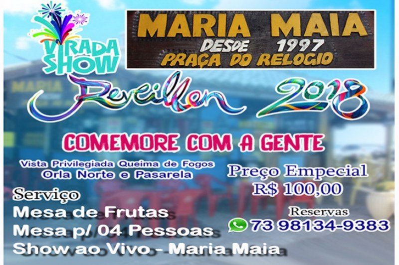Virada Show – Réveillon 2018 na Praça do relógio com Maria Maia é o local perfeito para celebrar a chegada do Ano Novo ao som de boa música e queima de fogos à Beira Mar. Convide seus familiares e amigos e faça já sua reservas através do WhatsApp 73 98134-9383 Desde Já o Quiosque Maria Maia deseja a todos um Feliz Natal e um Próspero Ano Novo.