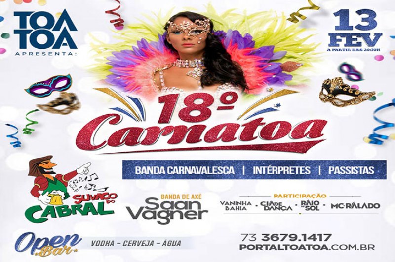 O Tôa Tôa realiza sua 18ª edição com um mix do melhor do Carnaval: Banda de Axé, Escola de Samba, Concurso de Melhor Fantasia, Make Musa do Carnaval, e tudo isso em um delicioso evento Open Bar. O tradicional CarnaTôa terá a sua 18ª edição dia 13.02 à partir das 20:30hs com todo conforto, segurança e comodidade. As atrações da noite prometem fazer da terça-feira de carnaval o seu melhor dia do ano.