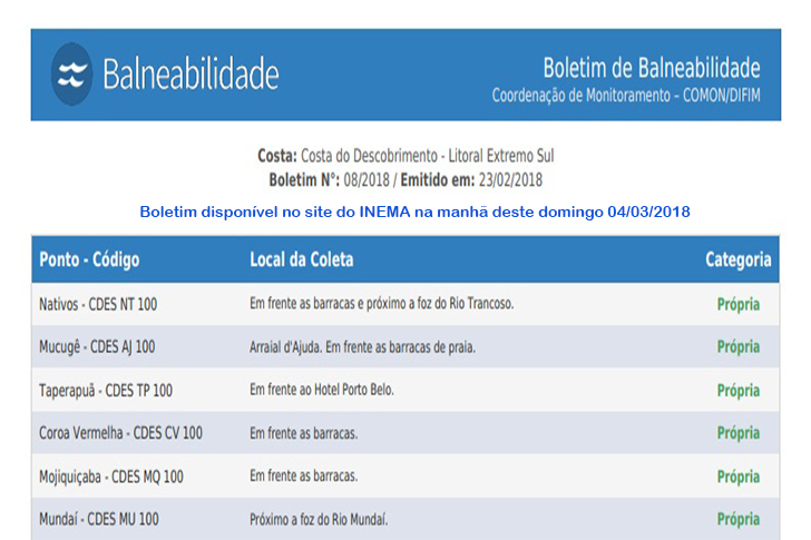 Veja abaixo o único boletim disponível no site do INEMA na manhã deste domingo 04/03/2018 e o Boletim apresentado pela prefeitura de Porto Seguro.