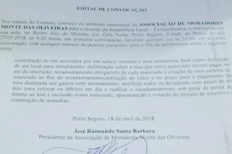 MONTE DAS OLIVEIRAS para a reunião da Assembléia Geral – Extraordinária, a realizar-se em sua sede, no Bairro Alto do Mundaí, s/n, Orla Norte, Porto Seguro, Estado da Bahia, no dia