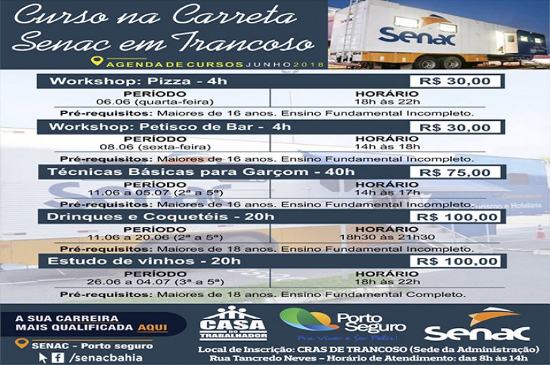 São cinco cursos iniciais, entre eles estão Workshops de Pizzas e de Petiscos de Bar; além dos cursos Técnicas Básicas para Garçon, Drinks e Coquetéis e Estudo de Vinhos. As aulas serão ministradas a partir de 6 de junho, nos turnos vespertino e noturno, em uma unidade móvel do Senac que já se encontra na Praça da Independência, em Trancoso. Posteriormente, outros cursos serão ministrados, de acordo com a procura.