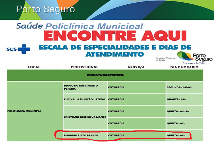 Na manhã desta quinta-feira 07/06, o ortopedista Drº Rodrigo Rizzo Bravin, que possui horário de atendimento fixado no site da prefeitura de Porto Seguro (quita-feira às 09:00), de acordo com imagem abaixo. Chegou mais sendo na unidade, fez ATENDIMENTO RELÂMPAGO e as 09:00, horário que deveria iniciar o atendimento já havia encerrado o atendimento.