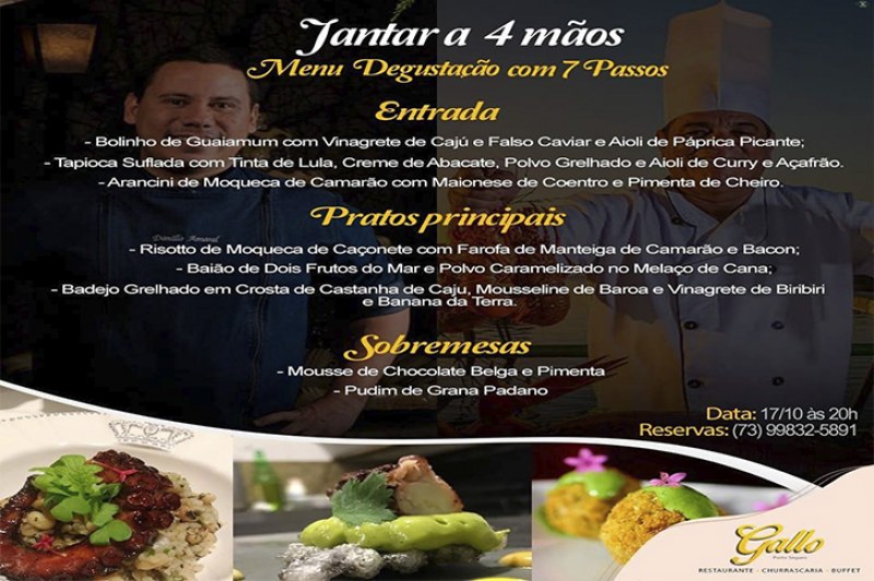 Porto Seguro: Restaurante do Gallo Miusic Bar promove o 1º Jantar a 4 Mão com o Chef Danillo Amaral, vai ficar de fora desta deliciosa oportunidade gastronômica? Garanta já sua reserva através do número 73 99832-5891.