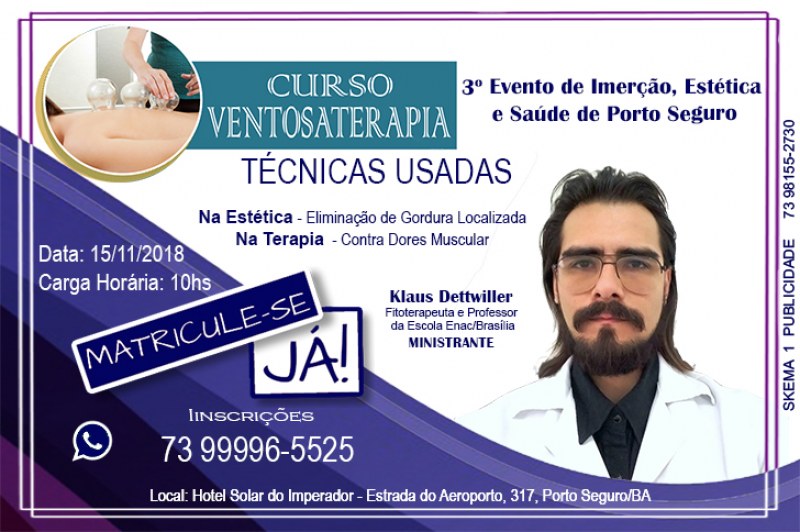 O Hotel Solar do Imperador irá sediar o 3º Evento de Estética e Saúde de Porto Seguro nos dias 15, 16 e 17 de novembro, serão três dias com “Imersão de Cursos”. O evento irá fazer abordagens inovadoras no que há de melhor no mercado, uma oportunidade para os profissionais da área se qualificar, oferecer novos serviços, atrair e fidelizar seus clientes.