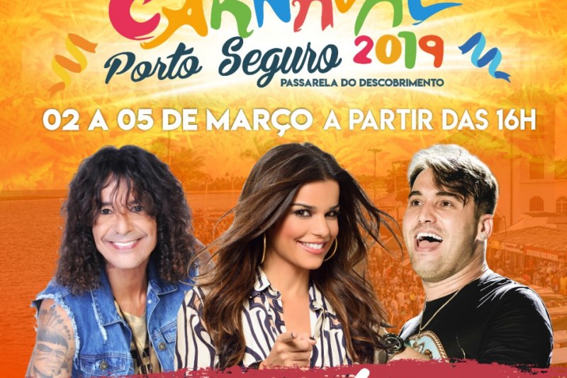 O Carnaval de Porto Seguro será realizado pela Prefeitura, com apoio do Governo do Estado, por meio da Bahiatursa, na Passarela do Descobrimento, entre os dias 2 de 5 de março de 2019. Na manhã desta segunda-feira (18), mais três atrações foram confirmadas pela prefeita de Porto Seguro, Cláudia Oliveira: Luiz Caldas, Babado Novo e Tayrone. A festa deve receber mais de 100 mil pessoas por dia e a novidade desse ano é que o evento começa mais cedo, às 16h. A entrada é gratuita.