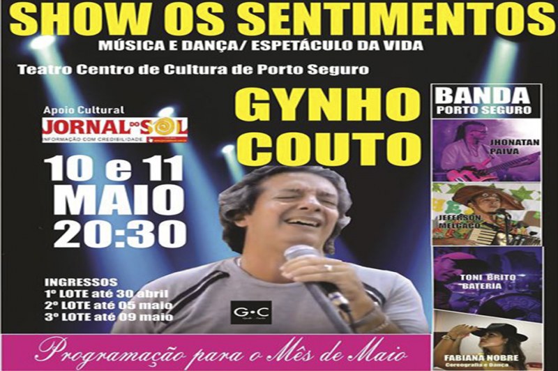 Na próxima sexta-feira 10/05, Porto Seguro terá a oportunidade de participar de um grande evento cultural com abrangência à música, dança e expressão teatral. No evento, o artista Gynho Couto canta “Os Sentimentos”, uma apresentação eclética com um repertório que vai do Axé, Afoxé, Forró, Rock Progressivo, Balada Pop, Rap, Reggae, Sertanejo e música instrumental.