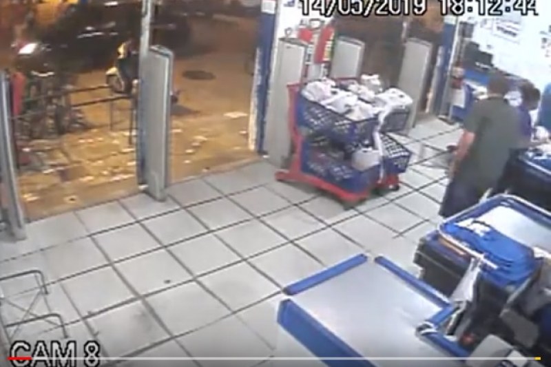 Cliente e funcionários do Vipão Supermercado do Bairro Mirante foram surpreendidos na noite da última terça-feira 14/05 quando um assaltante adentrou o supermercado e anunciou um assalto. O flagrante foi registrado pelas câmaras de segurança às 18:12:41 às 18:14:01, no total a ação do bandido durou 01 minuto e 20 segundos.