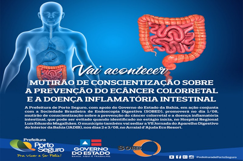 Com o objetivo de divulgar e conscientizar a população sobre a prevenção do câncer colorretal e a doença inflamatória intestinal, que pode ser evitado quando identificado no estágio inicial, a Sociedade Brasileira de Endoscopia Digestiva (SOBED), em parceria a Prefeitura de Porto Seguro, com apoio do Governo do Estado da Bahia, promoverá no dia 1/08 Mutirão no Hospital Regional Luís Eduardo Magalhães. O município também vai sediar a VII Jornada do Aparelho Digestivo do Interior da Bahia (JADIB), nos dias 2 e 3/08, no Arraial d'Ajuda Eco resort.